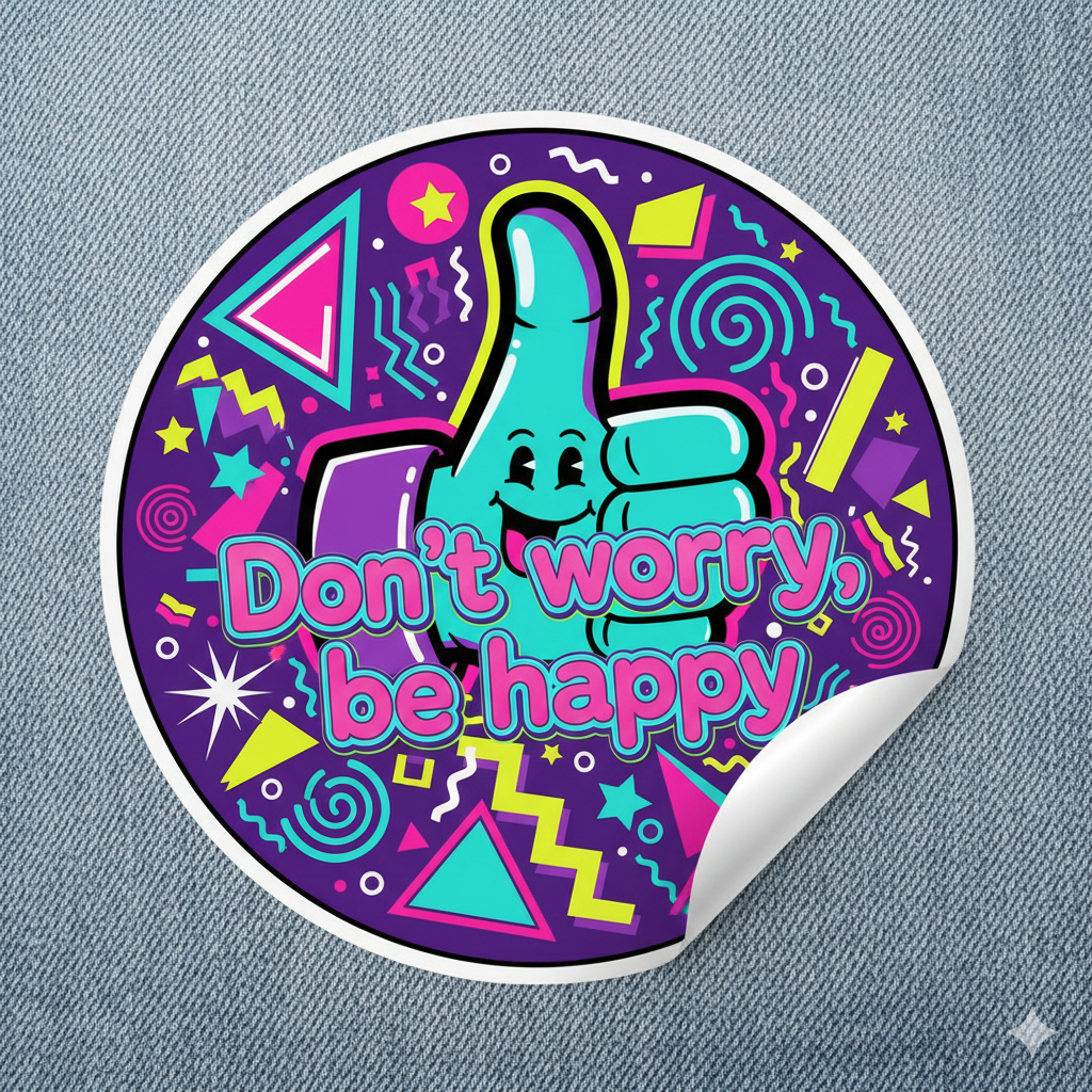 Create a vibrant and colorful sticker design that embodies the aesthetic of the 1980s. The sticker should feature bold and bright colors, typical of the era. At the center of the design, include a large, cartoonish thumbs-up symbol, exuding positivity and enthusiasm. Overlay the image with the text: "Don't worry, be happy" in a font style that echoes the cheerful and carefree vibe of the 1980s. The text should be playful and lively, possibly with a neon or glowing effect to emphasize its upbeat message. The overall composition should evoke a sense of joy and nostalgia for the 1980s, making it look like an authentic piece of memorabilia from the decade.
