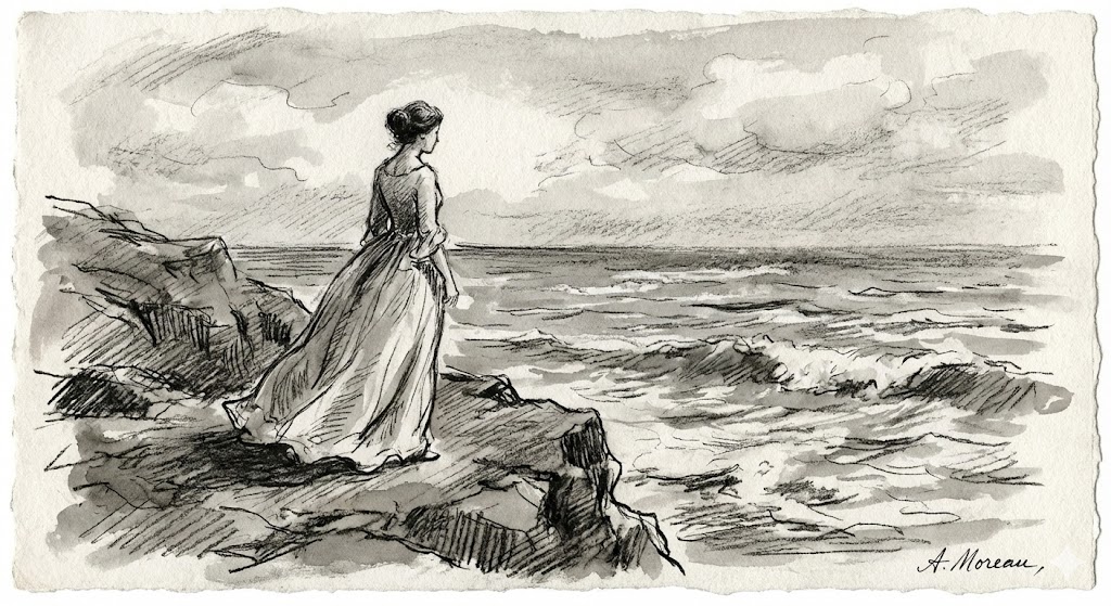A sketch of a woman standing on a cliff looking at the sea in a fancy art style
